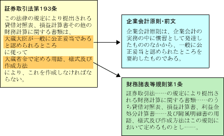 証取法における位置づけの根拠企業会計原則と財務諸表等規則が証取法会計の体系の中でそれぞれ会計処理規定、財務諸表の表示規定と位置づけられている根拠は、証券取引法第193条と、企業会計原則前文及び財務諸表等規則第1条とにあります。 |