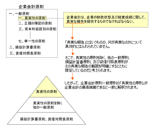 企業会計原則の理論構成企業会計原則は、会計処理全般に係わる包括的な処理規定である一般原則、損益計算書を作成する際の具体的な処理規定である損益計算書原則、そして貸借対照表を作成する際の具体的な処理規定である貸借対照表原則と、おおまかに3つの部分により構成されています。 企業会計の最高規範企業会計原則のなかでも一番最初に規定されている一般原則の真実性の原則は企業会計の最高規範とされ、真実性の原則を除く他の一般原則、損益計算書原則および貸借対照表原則は真実性の原則でいう「真実」の内容を明確にするとともに、その範囲を限定するものであるとされています。 |