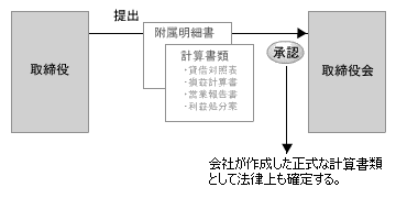 計算書類作成の概要取締役は毎決算期に貸借対照表、損益計算書、営業報告書、利益の処分に関する議案及び附属明細書を作成し、取締役会の承認を受けなければなりません。(商法281条 計算書類・附属明細書の作成・監査) 取締役が計算書類を作成全ての株式会社は、毎事業年度必ず商法上の財務諸表である計算書類とその附属明細書を作成しなければなりませんが、それら計算書類とその附属明細書は、必ずしも取締役自身が作成するわけではなく、会社の経理担当者や経理事務所などに作成を命じている、または作成を依頼している場合が通常です。 取締役会の承認取締役が作成した計算書類(取締役の責任に基づいて作成された計算書類)は、取締役会に提出され、取締役会の承認というお墨付きをもらう必要があります。このように取締役会の承認(お墨付き)を受けることで、計算書類等は、法律上、正式な計算書類等であるとみなされ、計算書類の確定として取り扱われることとなります。(計算書類の確定)