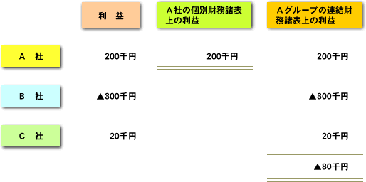 しかしA社が実質的に支配しているB社、C社といった子会社の業績を合算して「Aグループ」という視点からA社の業績をみてみると、A社は80千円の損失を計上している赤字会社ということになってしまいます。