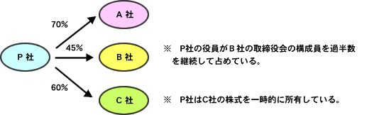 つまり下の図では、A社、B社が「P社の子会社」の範囲に含まれることになります。