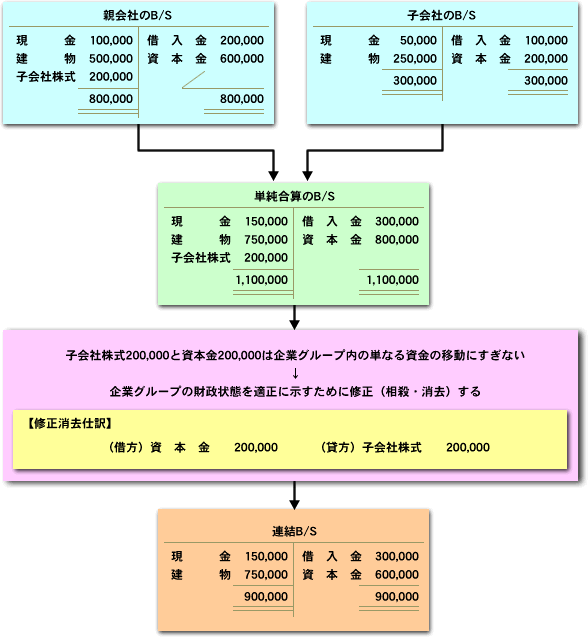 その際、親会社の子会社に対する投資(子会社株式)とこれに対応する子会社の資本の勘定は、企業グループという観点からみれば、単なる「企業グループの内部における資金の移動」にすぎません。