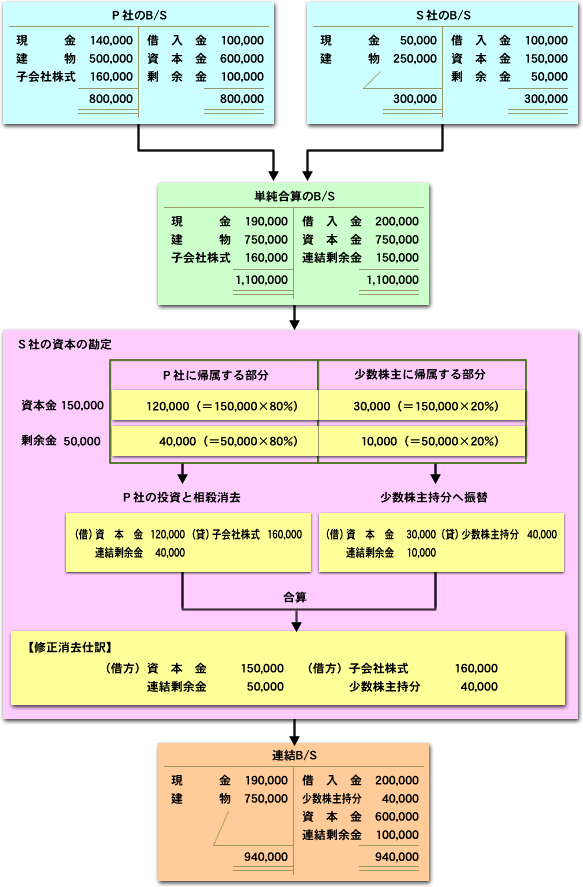 1. 株式の取得日又は支配獲得日の当該子会社の資本は、当該取得日又は支配獲得日において、親会社に帰属する部分と少数株主に帰属する部分とに分け、前者は親会社の投資と相殺消去し、後者は少数株主持分としして処理するものとする。 |