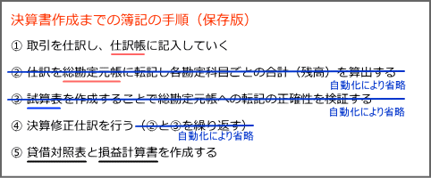 この場合における試算表の役割は「総勘定元帳への転記の正確性の検証」です。これが本来の意味における試算表の役割です。 会計ソフトを使った簿記一巡の流れそれに対して、現代において会計帳簿の作成は手作業ではなくほとんどの場合会計ソフトへの入力により行うのが普通です。この場合ほとんどの作業が自動集計されますので簿記一巡の流れがかなり省力化されます。