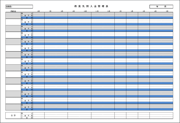 得意先別の売上高とその入金予定日、実際入金日を管理するための管理表です。 中小企業で一人親方の電気工事を請け負っているような会社を想定して作成しました。Excelに入力するのではなく、印刷してボールペン等で記載していく使用方法を想定しています。